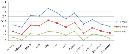 The graphs (Figure 9) records the differences on average in the whole territory between the periods 1991–2014 and 1931–1960; it highlights, for each parameter, a bell-shaped trend strongly increasing in spring and summer months, with a drop during winter and autumn. In February and September, minimum temperatures are in a counter trend because there is no strong temperature increase in these two months.