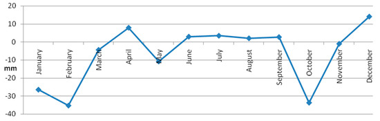 Precipitation has a reverse trend compared with temperatures (Figure 10) in that there is an absence or even an augmentation of precipitation in spring and summer, while the decreasing peak is focused on January, February and October, with significant amount between 25 mm and 35 mm. December is an exception, because it shows the highest augmentation of rainfall (about 15 mm).