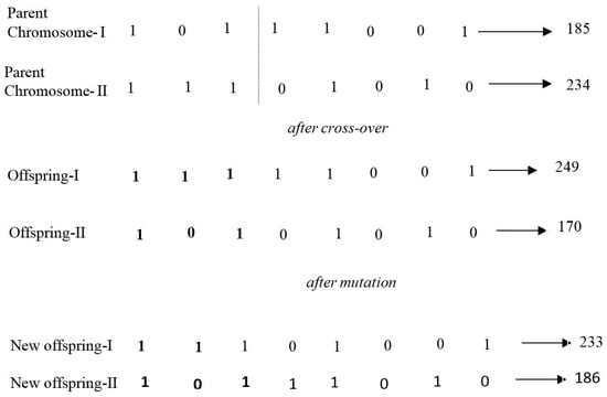 Once the fitness of each chromosome is calculated by Equation (5), then the selection process is performed using either the roulette wheel or the ranking method [14]. Pairing is done after the selection process, then the crossover and mutation operations are applied to each paired chromosome to produce new generations (offsprings). Figure 2 presents the crossover and mutation operations. As seen, the genes of the first two chromosomes (parent chromosome I and parent chromosome II) were cut from the third digit on the left and interchanged. This yielded a new pair of chromosomes (offspring I and offspring II). The original values 185 and 234 became 249 and 170, respectively. The mutation operation was applied onto the fourth digit from the left of each offspring by simply reversing digit 1 to 0 and digit 0 to 1, respectively. After the mutation operation, 249 and 170 became 233 and 186, respectively. More details on GA can be found in other studies [11,14,15].
