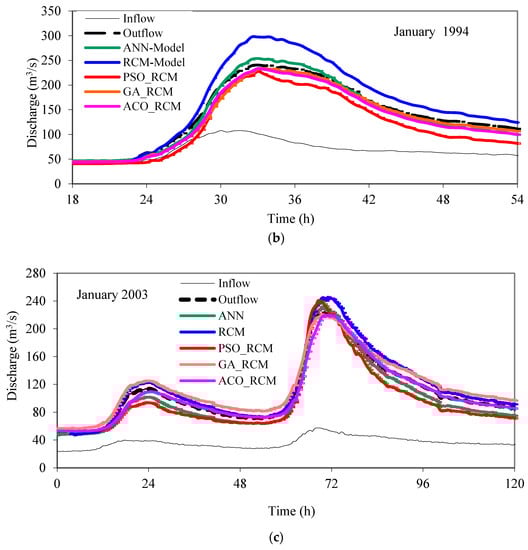 The other methods (GA, PSO, and ACO) were also tested against the RCM. These optimization methods, using the same flow hydrographs (the ones used in the training of the ANN) and by minimizing the same error function (Equation (11)) found the optimal values of the RCM parameters. We herein named them accordingly. For example, when the optimal values of the RCM are found using the GA method, we called it GA_RCM model. In the GA_RCM modeling, 80 chromosomes, 80% cross-over rate, and 4% mutation rate were used. The search space was (−3, 3) and (−10, 10) for α and β, respectively. It took 4200, 4600 and 6000 iterations for ACO_RCM, GA_RCM and SPO_RCM, respectively, to reach the optimum solutions. Table 2 presents the optimum values obtained by these methods.