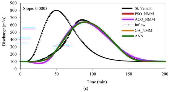 The inflow hydrograph, similar to the one shown in Figure 5, with maximum peak of 900 m3/s, time to peak of 26 h, and base flow rate of 120 m3/s, was routed in the same channel reach having three different bed slopes (So: 0.001, 0.0007, and 0.0003) by the St. Venant equations and the generated outflow hydrographs were used to obtain the optimal values of the NMM by the machine learning methods. The search space was 0–1 for K, 0–0.5 for x and 1–3 for m. It took 3000, 3600 and 4000 iterations for GA, ACO and SPO, respectively, to reach the optimum solutions. Table 4 presents the optimal values of NMM. Figure 5 presents the validation runs for a different inflow hydrograph having 100 m3/s base flow rate, 800 m3/s peak discharge, and 50 h for the time to peak. The inflow hydrograph was routed three times in the same channel reach having different bed slopes. Note that a single set of parameter values given in Table 4 were obtained for the same reach having different bed slopes. Also, note that with the same hydrographs that are used for the calibration of the other methods (GA_NMM, PSO_NMM, and ACO_NMM). In the training stage of the ANN, 5000 iterations and 0.04 for δ and α were employed.