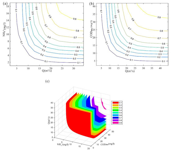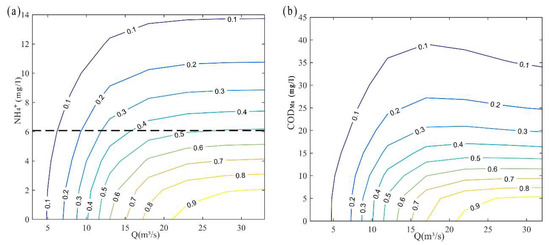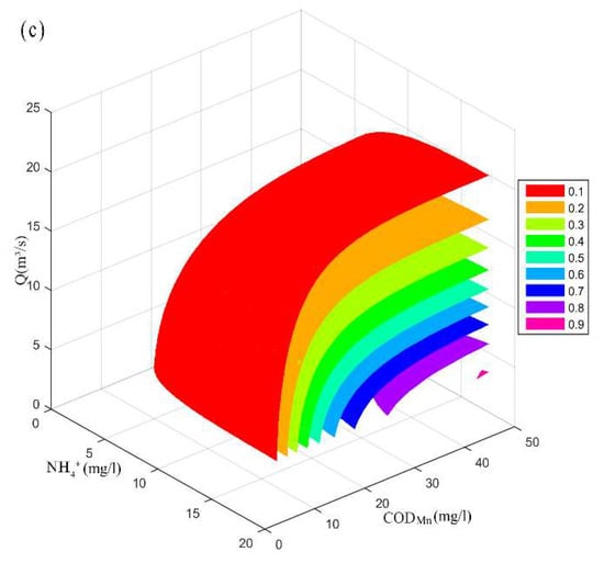 - The trivariate joint probability distribution of the combination of (Q, NH4+, CODMn) is more suitable for estimating the various exceedance probability of the water quality effectively under different discharge conditions. Thus, when the combination events (NH4+, CODMn) exceed their given values in the specific discharge situation, the exceedance probability can be calculated.