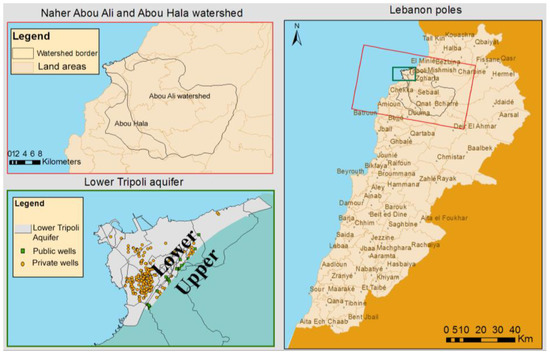 The Tripoli aquifer is situated in northern Lebanon and covers about 400 km2. It is delimited by the Abou Ali and Abou Halqa Rivers’ watershed. The aquifer is bounded by the Mediterranean Sea and the Mountain of Bcharré from the west and the east, respectively, and by the Mountains of Qalhat and Torbol from the south and the north, respectively (Figure 1).