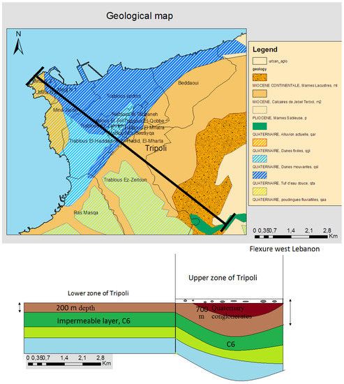 Geological map and stratigraphy of Tripoli, after Kalaoun et al. (2016) [12].
