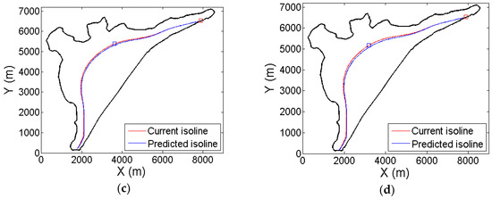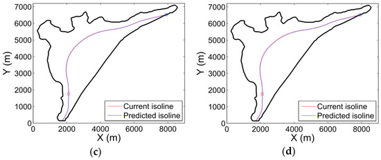 Advancement of the 100 meter level set of the seawater/freshwater interface for different sea level rises: (a) 50 cm; (b) 100 cm; (c) 150 cm; and (d) 200 cm.
