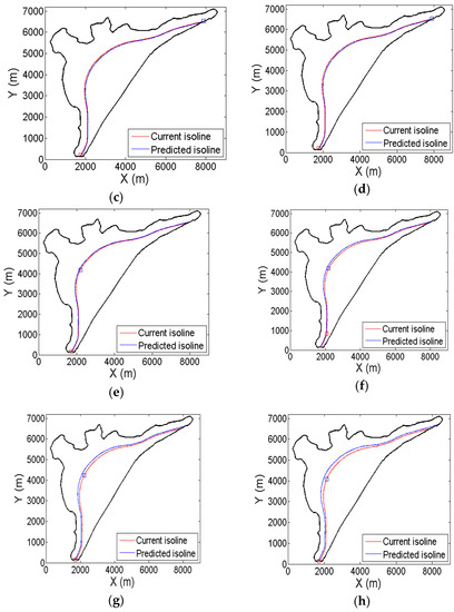Position of the 100 m level set of the seawater/freshwater interface for different values of flux: (a) 20% reduction; (b) 15% reduction; (c) 10% reduction; (d) 5% reduction; (e) 5% increase; (f) 10% increase; (g) 15% increase; and (h) 20% increase.