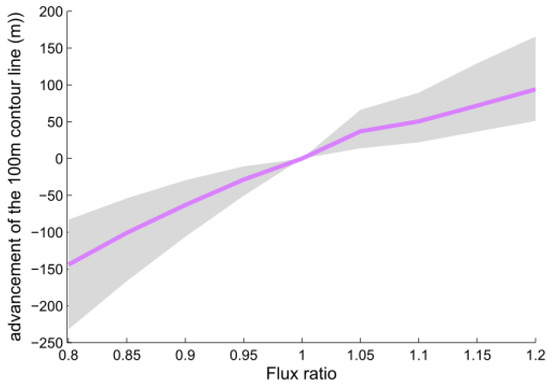 Advancement inland of the 100 m contour line of the seawater/freshwater interface with respect to flux ratio and years.
