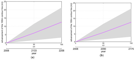 Advancement inland of the 100 m contour line of the seawater/freshwater interface with respect to sea level rise and years: (a) 4 mm per year; (b) 6 mm per year.