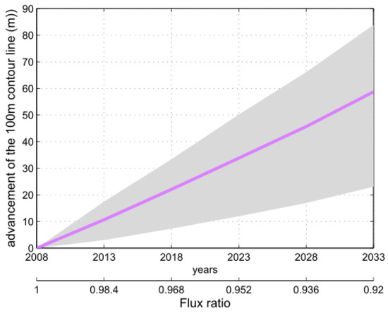 Precipitations and snowfall over the Lebanese mountains constitute the main source of freshwater to the Tripoli aquifer. The climate trends will impact the seawater intrusion. Following the projections from IPCC WGII AR5 [28], the precipitation is expected to decrease by about 20% from 1990 to 2050 in the study zone. This value is taken as a reference for the climate projection. A linear regression is used to estimate the yearly recharge decrease in the study area. We consider that the inflow flux will be decreasing proportionally to the change in climate change. From the previous statement, the flux of freshwater entering into the domain, Ψ, is decreased by 1.6% every 5 years. Figure 9 shows the impact of the recharge, decreasing the range of advancement inland of the seawater/freshwater interface in meters with respect to flux ratio and years. The purple line shows the median advancement. As expected, the results show advancement inland of the seawater interface, leading to increased salinization of the aquifer. A high variability of 100% is also obtained.