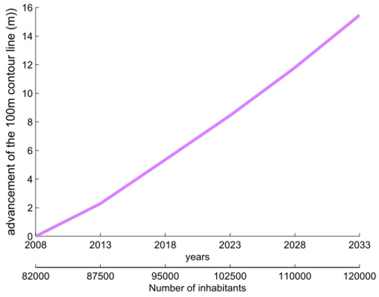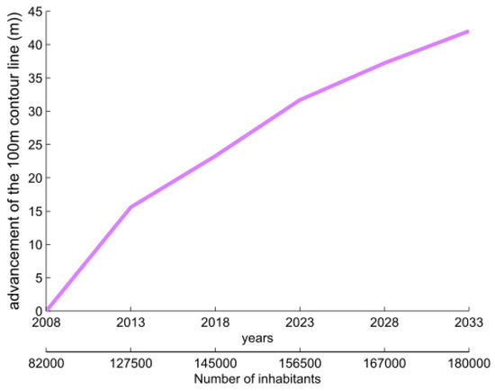 Advancement inland of the 100 m contour line of the seawater/freshwater interface with respect to the number of inhabitants and years.