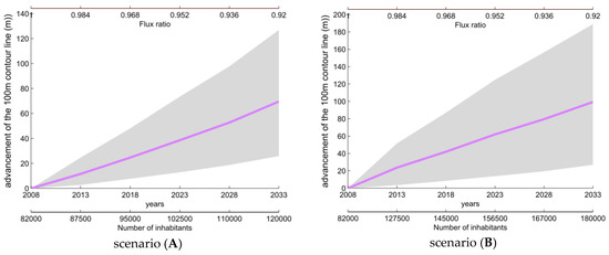 Advancement inland of the 100 m contour line of the seawater/freshwater interface with respect to flux ratio, years, and number of inhabitants in scenarios (A) and (B).