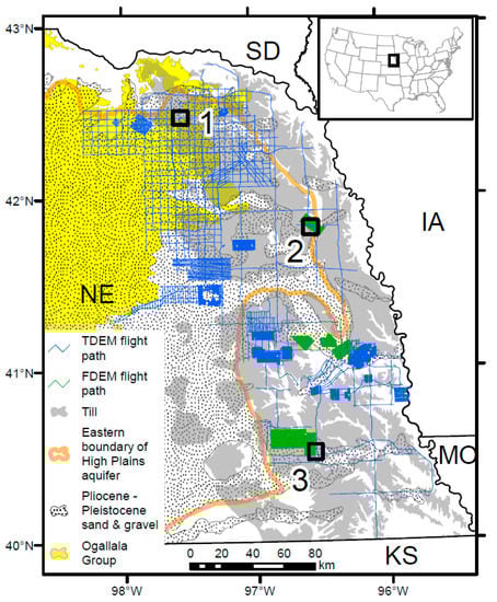Eastern Nebraska lies at the margin of the Great Plains of central North America. The margin is a transition zone where upper Neogene to early Pleistocene clastic sediments of the High Plains aquifer (HPA) give way to dominantly fine-grained Laurentide (Pleistocene) glacial deposits (Figure 1). The bedrock surface comprises Pennsylvanian and Permian shale and limestone in the southeast and Cretaceous sandstone, siltstone, shale, and chalk in the northeast. Bedrock units function mostly as confining units; however, aquifers are present locally within sandstone and chalk. The HPA is the principal aquifer in the region. It comprises the Neogene Ogallala Group and Pliocene to Pleistocene sands and gravels. The Ogallala consists predominantly of semi-consolidated silts, sands, and minor gravels and it is separated from older Paleozoic to Mesozoic strata by a widespread erosional unconformity [41]. Sheet-like sand bodies and thin mudstones were deposited in broad alluvial megafan systems associated with the erosional unroofing of the Rocky Mountains to the west [42,43,44]. These strata are erosionally and unconformably overlain on the far eastern margin by Pre-Illinoian glacial deposits associated with Laurentide (Pleistocene) glaciations of North America. Glacial deposits consist dominantly of clay-rich diamicton and stratified silts and fine sands. Secondary aquifers within the glacial region are associated with localized sand and gravel deposits from outwash systems, buried valleys, and Holocene alluvium. Buried valley aquifer units are common and were deposited by either (1) bedload-dominated streams within moderately wide (10 km), linear valleys atop bedrock, or (2) glaciofluvial systems and subglacial streams within narrow (~1–3 km), linear to slightly sinuous valleys encased within fine-grained glacial deposits [45]. Most of the landscape is blanketed by one to several layers of loess of variable thickness. Case studies presented herein are from three sites in eastern Nebraska, the details of which are presented later in the paper.