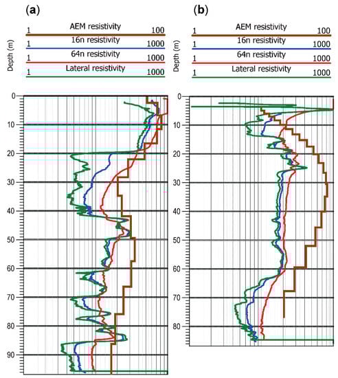 Comparison of 1D inversion models of airborne electromagnetic data (brown lines) and borehole resistivity logs (colored lines) from eastern Nebraska: (a) Time domain system; (b) frequency domain system. Legends at top show ranges of resistivity values (ohm-m) along logarithmic x-axis. Brown lines are 1D vertical inversion layers from AEM. Short-normal circuit (16n) in blue, long-normal circuit (64n) in red, and lateral device in green, from conventional wireline geophysical logs of open boreholes. Note that AEM resistivity range is 1–100 ohm-m, whereas range for borehole logs is 1–1000 ohm-m.