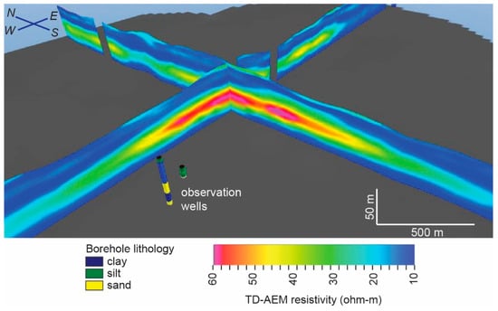 The electrical properties of the Earth depend on a variety of factors: Degree of saturation, clay content, sediment texture, porosity, water chemistry, and metallic mineralization [49]. The relationship between the electrical and hydrological properties of aquifers are non-unique and variable. In most aquifers, however, host sediment or rock is typically nonconductive (sand, sandstone, limestone); variations in electrical conductivity primarily relate to water chemistry and clay content. If groundwater is fresh, electrical conductivity is strongly correlated with clay content [24,50,51,52]. Nevertheless, auxiliary information is necessary to verify such relationships.