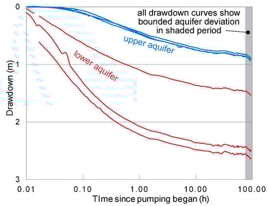 In a confined aquifer of infinite extent, a semi-logarithmic plot of drawdown versus time would form a straight line [68]. The drawdown and recovery curves in this pumping test behave initially as would a confined aquifer. After 20 min, however, rates of drawdown decline, forming a curved line typical of a leaky confined aquifer. Further evidence of leakage from the upper to the lower aquifer through the confining unit is shown in the response of the upper aquifer, which declines a total of ~1 m during the pumping period.