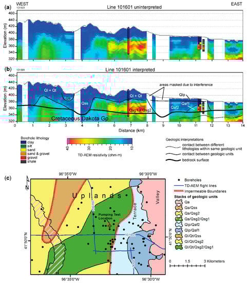 AEM data collection, pumping test, and water-level monitoring was funded through various projects by Nebraska’s Natural Resources Districts, with additional funding from the Nebraska Natural Resources Commission and the Nebraska Environmental Trust. AEM research by the author was funded by Nebraska’s Natural Resources Districts and the Nebraska Natural Resources Commission (Water Sustainability Fund), grant number 4164. The author’s research program is supported by the U.S. Department of Agriculture National Institute of Food and Agriculture (Hatch project NEB-21-177, accession number 1015698) and the Daugherty Water for Food Global Institute at the University of Nebraska.
