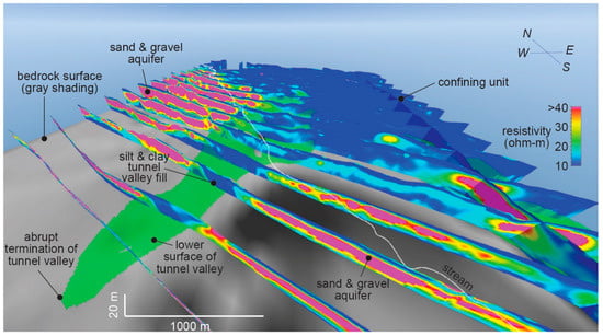 A block-type FDEM survey was flown in 2007. It comprised 52 east–west traverses spaced ~280 m apart and two north–south tie lines 6 km apart. The depth of investigation varies between ~50–80 m, which is sufficient to penetrate the entire thickness of unconsolidated materials above bedrock in the studied area. A detailed, 3D geological model has been presented in previous work [45,46]. Resistivity-depth profiles show a zone of high resistivity (>20 ohm-m) in the southwest and a zone of low-resistivity (<20 ohm-m) in the northeast (Figure 9). A narrow, wedge-shaped body of low resistivity extends southward into the zone of high resistivity. It is continuous in resistivity-depth profiles across the stream valley from north to south, terminating under the uplands ~1 km south of the valley margin.