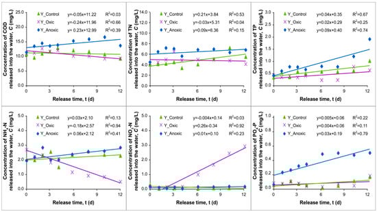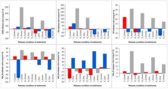 The release rates of organic matter and nutrients for the four study sites are shown in Figure 6 and summarized in Table 5 according to the experimental conditions. These release rates varied according to the pollution source, year of construction, and experimental environmental conditions (control, oxic, or anoxic). The following factors were included in the analyses of the release rates: COD (−138.3–347.3 mg/m2·day), TN (−75.9–301.2 mg/m2·day), TP (−14.6–42.4 mg/m2·day), NH4-N (−97.2–51.1 mg/m2·day), NO3-N (−29.3–51.7 mg/m2·day), and PO4-P (−0.9–31.0 mg/m2·day). The analyses showed that COD, TN, TP, NH4-N, and PO4-P had high release rates under anoxic conditions and exhibited relatively little or no release under oxic conditions. This result is ascribed to the release of organic matter, nutrients being reduced or suppressed as oxidation proceeds, and nitrification caused by an excess of DO under oxic conditions.