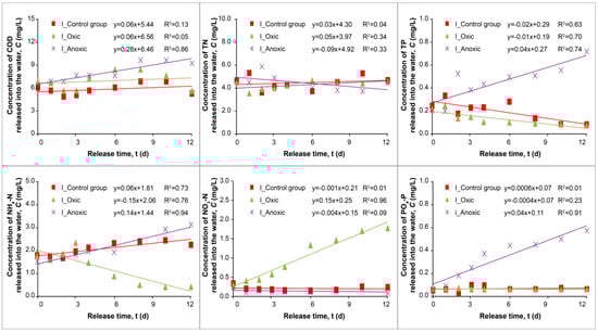 The variations in the concentrations of organic matter and nutrients, with the release time, are shown in Figure 3 (Y reservoir) and Figure 4 (I reservoir). Reservoir Y, which received livestock pollution loads, showed a decrease in COD concentration under oxic conditions over time. This is because easily decomposable organic matter is deposited on the sediments. As the oxygen supply increases, the aerobic microorganisms decompose the organic matter using oxygen as an electron acceptor; however, the organic matter concentration is reduced by molecular diffusion in the water. In contrast, the COD concentrations were not significantly reduced under oxic conditions in the other reservoirs. No specific variation with changes in conditions was detected in the release results for TN.