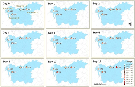 The spatial and temporal distribution maps for all four reservoirs are shown in Figure 5 so as to facilitate comprehension of Figure 3 and Figure 4. The maps for TP were prepared for the concentrations that show the most prominent release under anoxic conditions. This presentation can confirm the magnitude of the change in the release concentration over time in the reservoir. Figure 5 shows that the variation in the TP release concentration of reservoirs Y and G, which experienced livestock pollution, was the largest, and the release concentration was measured to be four times higher than the initial concentration after 12 days. This result suggests that dissolution of TP may occur when anoxic conditions last over several days.