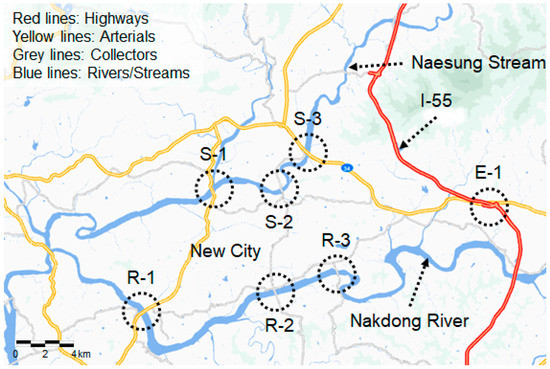 The new city is highly susceptible to flooding due to its geographic location. The new city has an area of 10.966 km2 and is surrounded by the Nakdong River, the Naesung Stream (a tributary of the Nakdong River), and highway I-55 (Figure 1). Six bridges (i.e., S-1, S-2, S-3, R-1, R-2, and R-3) and one highway exit (i.e., E-1) are the only means to enter and exit the new city. In brief, its location is analogous to that of an island. Even temporary bridge closures would dramatically impact traffic conditions. Closures would result in route modifications that would increase driving distances and times. Such detours would create notable congestion on nearby roads, particularly on highway I-55. This phenomenon prompts the question: what would the economic cost be if some or all of the bridges were closed? In this paper, we attempt to answer this question through a case study examination. For this study, we limit our analysis to direct costs borne by road users, specifically costs resulting from increased travel distances. The estimates from this study will act as a guideline for identifying cost effective mitigation and preparedness strategies, which aim to reduce the frequency and impact of bridge closures due to flooding. These estimates could, for example, be associated with the cost of improving city resilience to flooding (e.g., the construction cost for the dredging of the river and its tributary and payment to contractors for the early reopening of the bridges).
