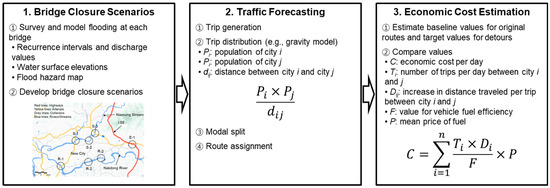 We propose a framework to evaluate the economic impact of bridge closures on road users. The proposed framework consists of three main steps (Figure 2): bridge closure scenarios, traffic forecasting, and economic cost estimation. Details for each step are provided in the following subsections.