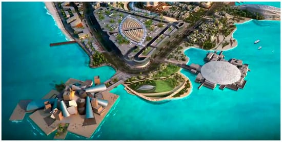 The present study focuses on Saadiyat (Figure 1), a large low-lying 27 km2 island situated in the Gulf within the Emirate of Abu Dhabi. Saadiyat island hosts a vast national park of mangroves and a 9 km SW–NE oriented natural sandy beach, Saadiyat beach, populated by numerous flora and fauna species. Part of the island is undergoing a considerable development program. In March 2015, the “North Beach Phase 1 Development Plans” document was submitted to the Abu Dhabi Urban Planning Council as a part of the Shoreline Protection Works Master Plan, an addendum to the Concept Master Plan of the Saadiyat Cultural District. The urban plan includes the construction of new luxury hotels, a private luxury residential area, and the Cultural District with the Louvre and Guggenheim museums (Figure 2).
