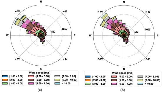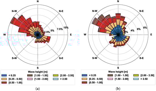 Figure 4 shows the NOAA N (a) and NOAA S (b) wind rose, indicating that the atmospheric conditions at the two locations can be considered uniform. In fact, the NOAA N and NOAA S nodes are exposed to the same atmospheric conditions, given the relatively small distance between the two nodes. Because of this similarity, for the SPM ’84 application, only the data from the north node have been considered; in particular, the wind stress , and wind direction, θ.