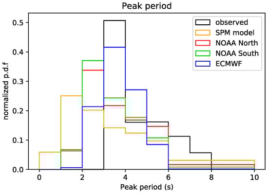 Field measurements showed that the Argonaut-XR appeared to be unable to measure wave peak periods smaller than 3 s, although the instrumental sensitivity range is 2–20 s, according to the system manual technical specifications []. Figure 7 shows the wave period normalized probability density function distribution (normalised p.d.f.) as measured by the ADMins, as determined by the NOAA and the ECMWF wave models at the closest location to the ADMins position, and as estimated by the SPM ’84. Figure 7 shows a cut-off at 3 s in the peak period distribution measured by the ADMins. This is not in agreement with the results from the NOAA and ECMWF wave numerical models indicating that waves with a 3 s peak period appear in the area.