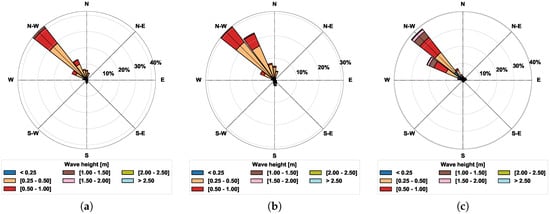 NOAA wave rose at the north node (a), NOAA wave rose at the south node (b), and ECMWF (c) wave rose in proximity of the ADMins.