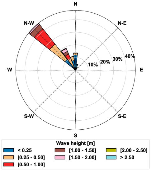 Figure 8 shows the wave roses from SPM ’84 (1979–2009) and ADMins (June 2015–January 2018). The maximum value of the significant wave height, Hs, recorded at a 6 m water depth in front of Saadiyat beach, was around 2 m. The SPM ’84 underestimates the low (0.25–0.50 m) and high (1–2 m) waves, respectively. For each wave height class, Figure 9 depicts the difference between values of appearance frequency (af) in %, determined by SPM ’84 and observed by ADMins; the difference appears to be small, therefore the af determined by SPM ’84 and observed by ADMins are in fairly good agreement. The largest differences were found for values of wave height between 1 and 1.5 m.