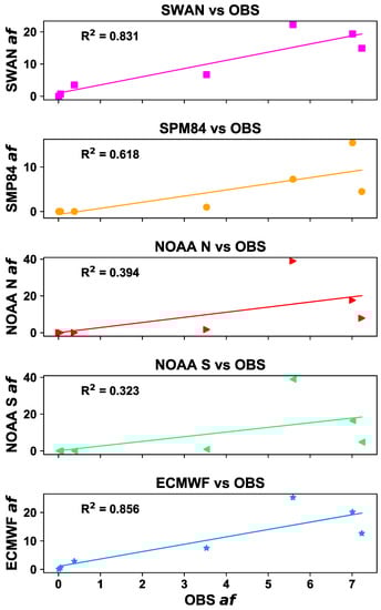 Analyzing the correlation in each class of Hs between the observations and each model, Figure 12 shows scatter plots of each hindcasting model af versus the observed af. Each subplot shows the values of the coefficient of determination, R2 calculated as: