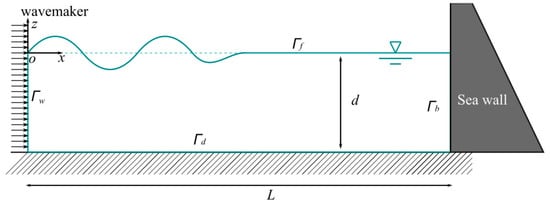 Consider a 2D numerical wave flume with a constant depth d and length L, as in Figure 1. The left boundary is a wavemaker and the right boundary is a vertical seawall. The wavemaker, free surface, vertical seawall, seabed and fluid domain are denoted by Γw, Γf, Γb, Γd, and V, respectively. A Cartesian coordinate system is set in Figure 1, with the origin at the left side of the undisturbed free surface boundary, the x-axis pointing along the propagation direction of incoming waves, and the z-axis pointing upwards. The fluid is assumed to be incompressible, inviscid, and flow-irrotational. The velocity potential φ(x, z, t) is introduced to describe the fluid motion.