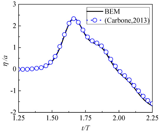 where S(t) is the horizontal displacement of the wavemaker, k is the wavenumber, μ is the parameter that controls the width of the waves envelope, τ is the parameter that controls the initiation of the wavemaker’s motion to avoid an abrupt disturbance, and S0 is the stroke of the wavemaker which is relevant to the maximum incident wave amplitude. Wave run-up histories on the wall are presented in Figure 13. For all cases, non-dimensional parameters are set as a = 0.05, μ = 2.0 and τ = 5T. From the wavemaker motion Equation (23) we can expect that the wave amplitude can get larger as time goes on before reaching its maximum at t = τ.