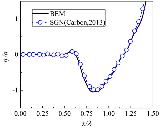 Then, extending the simplified situation of continuous regular waves and solitary wave-to-wave train, some work has been done. Carbone et al. [21] observed in their numerical simulations that a multi-crest wave train can produce higher wave run-ups on a vertical wall, compared with the corresponding regular wave cases. The wave run-up can exceed the incident wave amplitude by a factor of five, which is a remarkable amplification of the incident wave amplitude. In their simulations, the Serre-Green-Naghdi (SGN) model, which satisfies a weak dispersion relationship, was adopted [22,23,24,25], which loses accuracy in water of finite depth for high amplitudes [26]. Akrish et al. [27] further investigated a modulated multi-crest wave train impacting a vertical seawall using a high-order spectral method (HOS). An unusual amplification of the wave run-up was also found, although the HOS model was still limited to the expansion of nonlinear terms in a weakly nonlinear sense. However, according to their studies, this process shows very strong nonlinearity. Some important phenomena may be missed due to the possible deficiency of nonlinearity. Thus, a model with enough nonlinearity should be applied. In this study, a higher-order BEM is applied which can preserve full nonlinearity. A numerical wave flume is developed to model the multi-crest wave train impacting on a vertical seawall. Strong nonlinear characteristics of wave run-ups and loads on the vertical seawall are further investigated.
