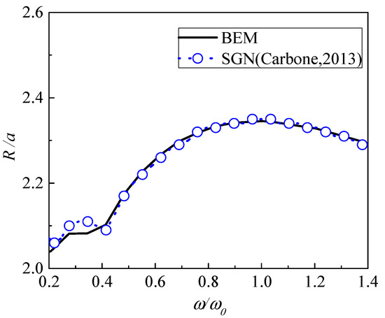 We set the angular frequency as ω = 0.145 and amplitude as a = 0.05. Figure 3 shows the time history of the free-surface run-up along the vertical seawall. Figure 4 gives the profile of free surface at t = 1.67T. Figure 5 further compares the maximum wave run-up (MWR) along the vertical seawall for more wave frequencies. The obtained numerical results are compared with those of the SGN model [21]. In all these figures, the numerical results agree well with the corresponding SGN results, as a verification of the present model. The MWR is approximately twice the amplitude of incident waves when the wave frequency is low, which is consistent with the result predicted by linear potential-flow theory. At ω = ω0 = 0.145, the MWR reaches its maximum of 2.3a, indicating strong nonlinear characteristics. Here, ω0 represents the frequency at which the MWR is the largest.