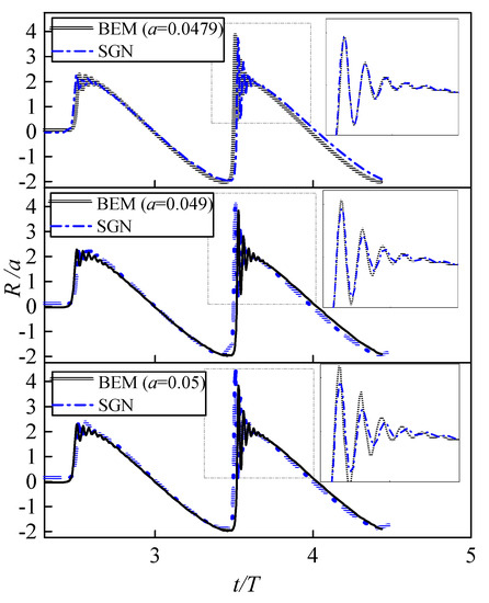 This subsection further considers cases of the double-crest wave train. The incident wave frequency is set as ω = ω0 = 0.02. Three different amplitudes of incident waves are considered in Figure 6. The present results agree well with the SGN model results when the first wave crest impacts on the wall. However, the discrepancies between the two models become evident during the run-up process of the second wave crest. The wave run-up history of the double-crest wave train shows a feature of high-frequency oscillations. The oscillation is more obvious during the run-up process of the second wave crest. This shows strong nonlinear and high-frequency characteristics, which may be due to the interaction between components of difference frequencies. For the case of a = 0.05, the MWR of the present model can reach 4.4 times the incident wave amplitude, while it is 3.8 times for the SGN model. Then we decrease the nonlinearity by using a smaller incident wave amplitude. We can find, after decreasing nonlinearity, the second run-up histories match well, for a = 0.0479. Although the amplitudes of these cases are close, they can still lead to obvious differences.