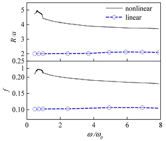 The MWR along the vertical seawall and the maximum wave force acting on the vertical seawall for double-crest wave trains of different wave frequencies are shown in Figure 11. The trends of these two physical quantities are very similar. The amplitude peaks locate at ω = 0.2. The MWR is 5 times the incident wave amplitude, and the maximum wave force can reach 2.5 times that of the linear theory one. For ω > ω0, both of the wave run-up and wave force of the nonlinear waves reduce, but they are still larger than the corresponding linear results.