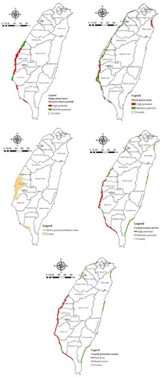 Hazard-prone areas were demarcated following the criteria for “High potential” (Table 1). Areas prone to flooding due to storm surges and floods were estimated through numerical simulations. Coastal erosion and ground subsidence areas were demarcated based on survey data sourced from the Water Resource Agency of Taiwan. Furthermore, potential tsunami threats for coasts around Taiwan were taken from the results of the National Science and Technology Center for Disaster Reduction (NCDR, 2015) [43]. The detailed procedure can be found in the following case study.