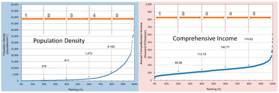 Vulnerability was scored on a scale of 1 to 5, with 1 indicating the least vulnerability, and 5 indicating greatest vulnerability. The population density and comprehensive income of the 898 villages within coastal areas in Taiwan were divided into five classes, by ranking them in 20% increments in ascending order (Figure 2). Five classes were also used to score land use, with vulnerability referring to the impact on human life and property (Table 2). The level of vulnerability estimated in the risk matrix is the average score of the three indicators.