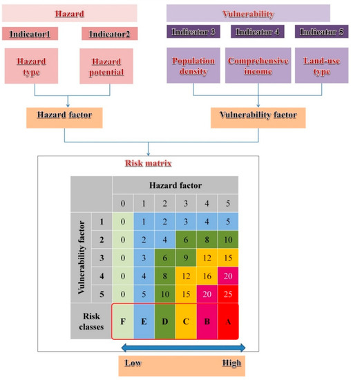 The hazard and vulnerability factors were multiplied in a 6 × 5 risk matrix, generating six risk classes ranging from A to F that denoted high, high-intermediate, moderate, low-intermediate, low, and minimal protection levels, respectively. These risk classes were subsequently used to determine the appropriate design criteria. The assessment procedure and framework for this method are presented in Figure 3.