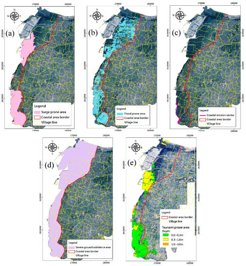 Figure 4. GIS layers of the coastal hazard-prone areas in Yunlin County, consisting of (a) surge, (b) flood, (c) erosion, (d) ground subsidence, and (e) tsunami prone area layers. - Floods: A GIS layer of flood-prone areas with an inundated depth of over 1 m for a 50-year return period was acquired from the Water Hazard Mitigation Center (WHMC, 2014). (WHMC, 2014) [45]. Flood hazard-prone areas are shown in Figure 4b.