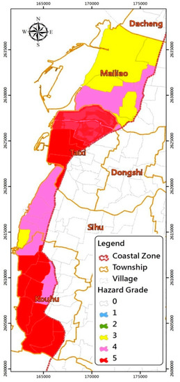 The data for the five hazards were all acquired from official sources, in accordance with the stated requirement of data impartiality in this study. After overlaying the resulting five coastal hazard-prone area layers, we found that Kouhu Township was subject to a combination of all five hazard types. This township made up over 66% of the total hazard-prone area, resulting in a hazard factor score of 5. The rest of the villages had scores of 3 or above. The hazard factor score of each village is presented in Figure 5.