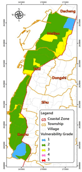 Population density, comprehensive income, and land use data were acquired from county government statistics, and were used to estimate vulnerability. Population densities and comprehensive incomes of the villages within the coastal area of Yunlin range from 1 to 4, and 1 to 3, respectively. Land use scores are 2 or 3, with most of the villages constituting productive areas, although a few non-productive areas also exist. The vulnerability grading was derived from the average score of the three indicators for each village (Figure 6).