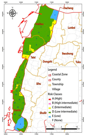 Risk maps for each village (Figure 7) were constructed by multiplying their respective hazard (Figure 5) and vulnerability (Figure 6) scores. The results show that most villages were classified as Level D (low-intermediate risk). Level C (moderate risk) was the highest risk class reached, and among these villages, only Yongfeng (in the Taixi Township) was adjacent to the shore.