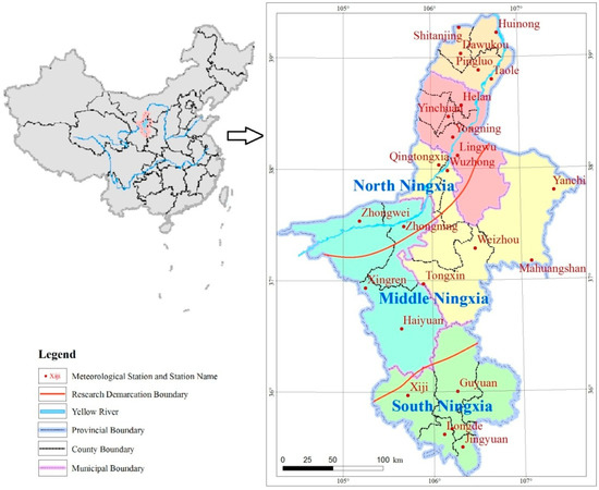 The Ningxia Hui Autonomous Region is located in the eastern part of northwestern China (104°17’–107°39’ E, 35°14’–39°23’ N, and has total area of 66,400 km2). The region extends in the north–south direction, which becomes relatively narrower towards the north and the south; the terrain is of a higher altitude in the south; the variation in elevation is larger in the west in comparison to the east. Ningxia can be divided into plains, mountains, loess areas, hilly areas, and sand dune areas [30,31]. The climate of the study area is a typical continental climate [32]. The average annual temperature is 8.22 °C; the average annual temperature increase rate is about 0.3 °C per 10 years. The average annual evaporation and the average annual precipitation are 2075.1 mm and 276 mm, respectively. The precipitation is very unevenly distributed throughout the year; the precipitation accounts for 14–18%, 51–65%, 20–28%, and 1–2% in spring, summer, autumn, and winter, respectively. There is a great variation in the interannual precipitation in the whole region, with a slight increasing trend (0.08% per 10 years). The precipitation in the region increases from the north towards the south, with higher variations in the former. In the southern region, the land is arid and has relatively low rain events; therefore, higher evaporation and dryness are witnessed, which indicates a region prone to meteorological disasters [33,34,35]. According to the multi-year average precipitation in the 200 mm and 400 mm contours of the study area, in combination with the topographic and geomorphological features, the study area is divided into three regions, which are the northern, middle, and southern regions. The northern region has a long-standing irrigation agricultural system, the middle region is arid and acts as a transitional region of the agro-pastoral ecotone, and the southern mountainous region is dominated by broad regions known for extensive crop production (Figure 1).