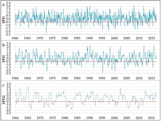 The standardized precipitation index (SPI) values at different timescales in Ningxia from 1960 to 2016. (a) SPI1 in Ningxia from 1960 to 2016; (b) SPI3 in Ningxia from 1960 to 2016; and (c) SPI12 in Ningxia from 1960 to 2016.