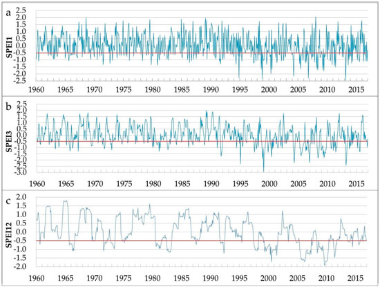 The standardized precipitation evapotranspiration index (SPEI) values at different timescales in Ningxia from 1960 to 2016. (a) SPEI1 in Ningxia from 1960 to 2016; (b) SPEI3 in Ningxia from 1960 to 2016; and (c) SPEI12 in Ningxia from 1960 to 2016.