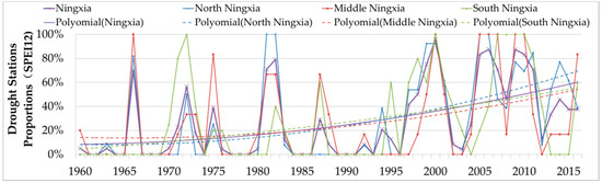 The drought stations proportions of the SPEI12 in three sub-regions and the whole Ningxia regions from 1960 to 2016.