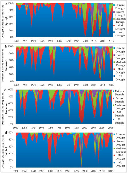 Cumulative drought stations’ proportions variation in Ningxia from 1960 to 2016. (a) Drought stations proportions in the whole region of each season; (b) drought stations proportions in the north Ningxia of each season; (c) drought stations proportions in middle Ningxia of each season; and (d) drought stations proportions in south Ningxia of each season.